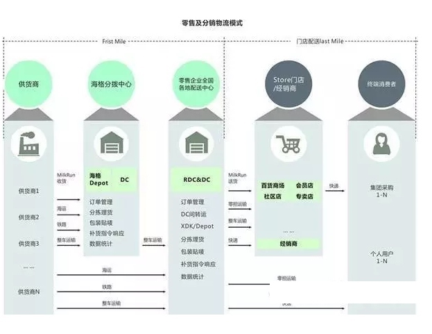 完整的流程为物流服务商从供应商收货,通过各种运输形式集货至物流企业的仓库进行分拣,分拣之后再运输至零售企业DC进行交仓。