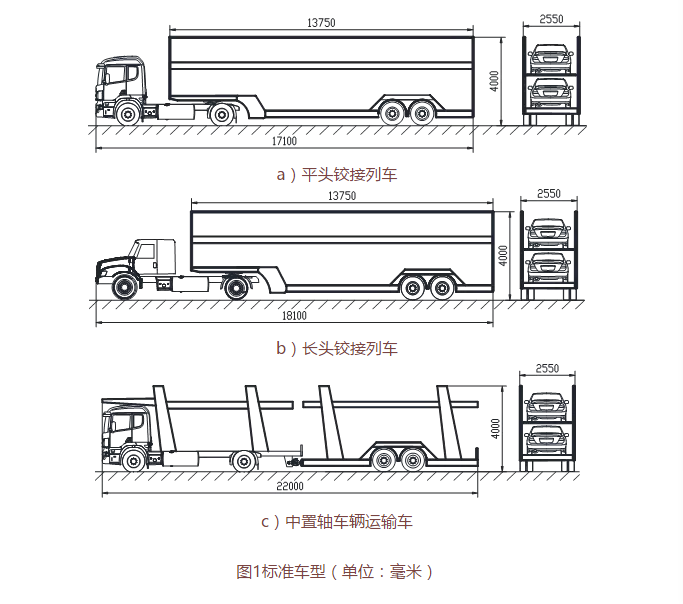 符合新修订《汽车、挂车及汽车列车外廓尺寸、轴荷及质量限值》(GB1589)要求的平头铰接列车、长头铰接列车及中置轴车辆运输列车车型如图1所示。