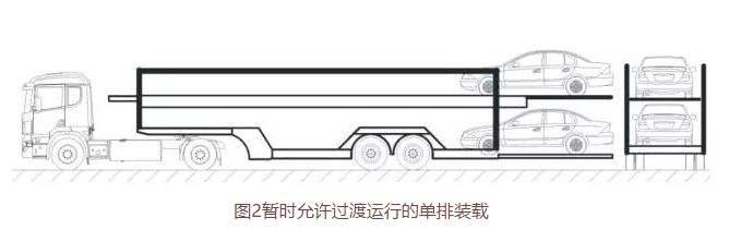 “单排车”是指上下单排装载,以及尾部装载的乘用车至少有一轴装载于车辆运输车车厢后立柱以内的,不符合国家标准的车辆运输车。暂时允许过渡运行的“单排车”单排装载方式如图2所示,2016年9月21日-2018年6月30日,暂时允许本方案发布之日前注册登记的“单排车”过渡运行。