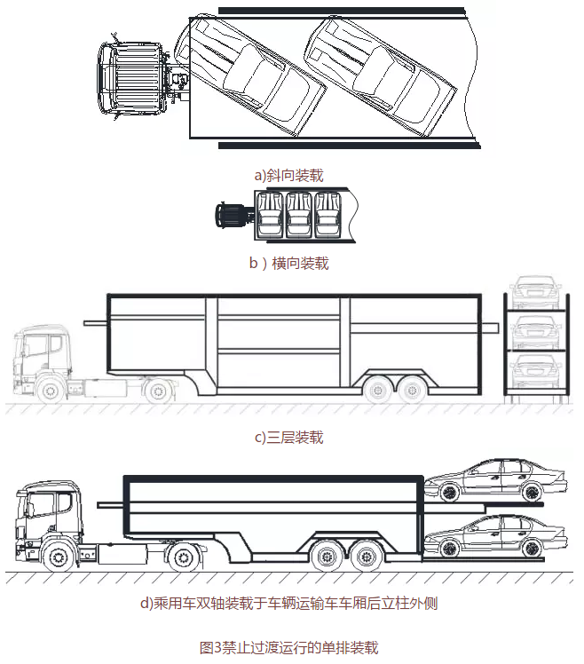 暂时允许过渡运行的单排装载方式不得斜向装载、横向装载、三层装载,也不允许乘用车双轴装载于车辆运输车车厢后立柱外侧,如图3所示。