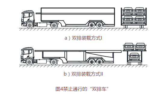 自2016年9月21日起,全面禁止“双排车”通行。“双排车”是指上下两层均双排装载或上层双排装载下层单排装载,且不符合国家标准的车辆运输车,车型如图4所示。