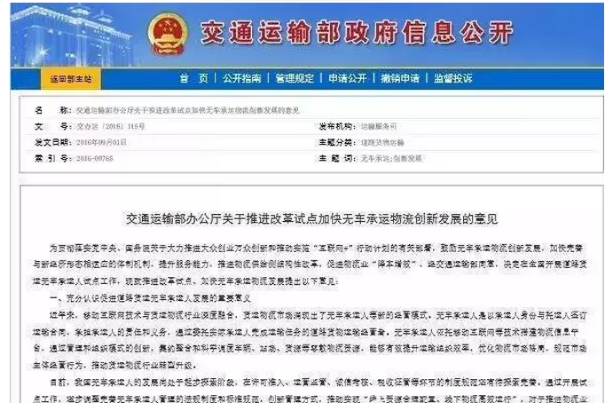 近日,交通运输部办公厅发布《关于推进改革试点加快无车承运物流创新发展的意见》。